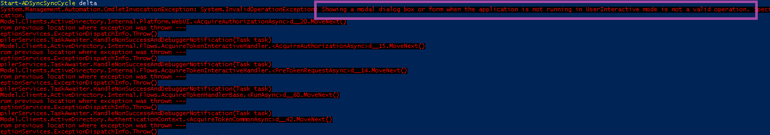 PowerShell gave below error message and the “Showing modal dialog box” indicated that this issue was related to MFA.